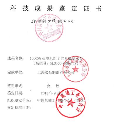 凝结水泵百万机组100%全容量技术鉴定证书